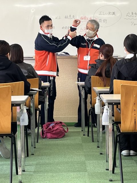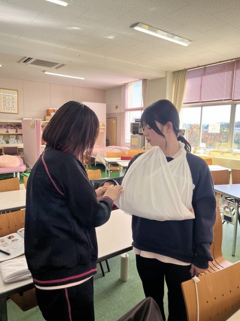 三角巾や包帯以外にも、ストッキングやハンカチなど身近なものを使ってできる応急手当は日常的にも役立つ内容でした。